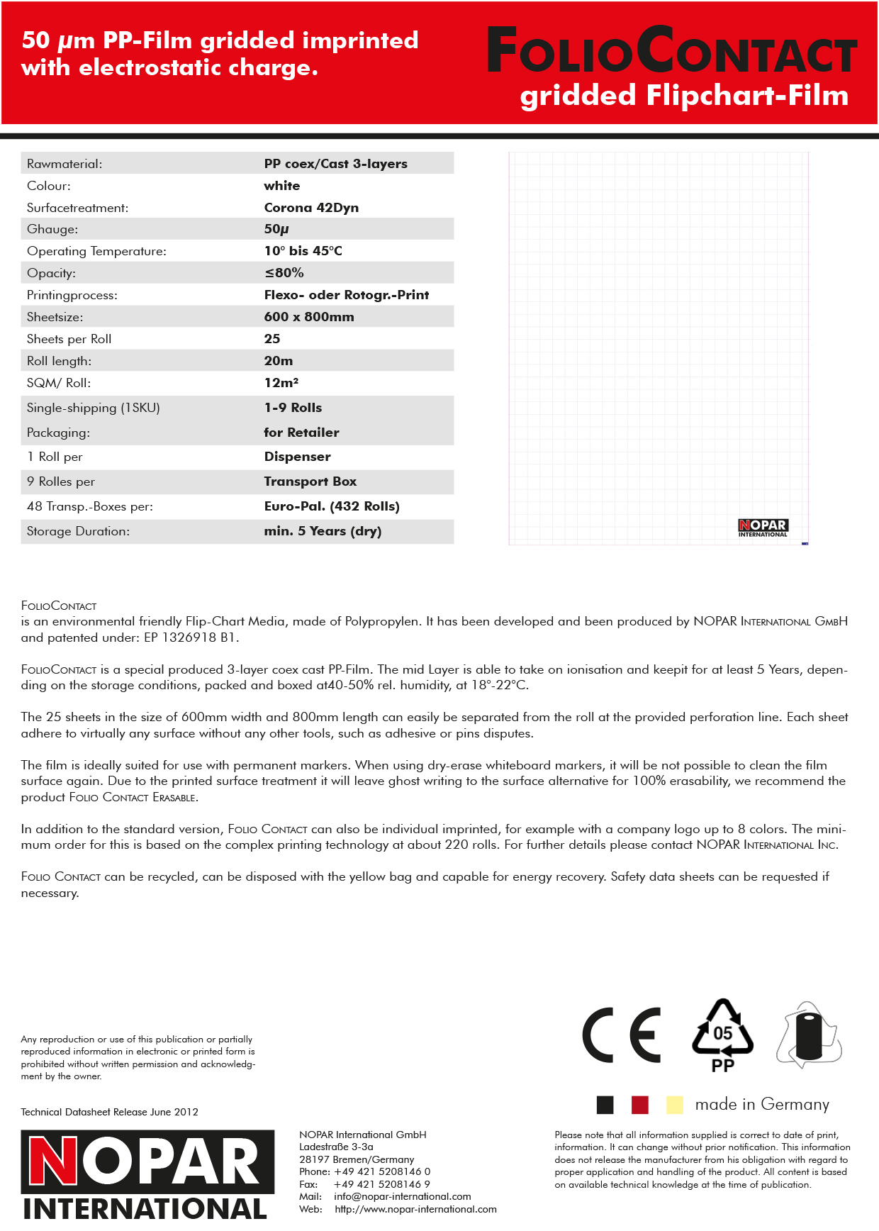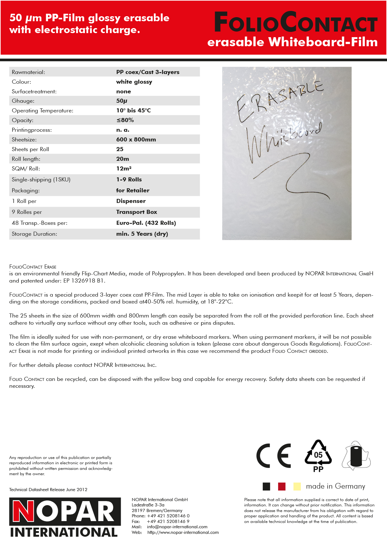 Met Contactfolie creeert u een whiteboard, flipchart of memo op ieder gewenst moment, waar u maar wilt. Door de electrostatische lading hecht Contactfolie op iedere vlakke ondergrond, zonder ooit residuen achter te laten. Meteen beschijfbaar. De flipchart is permanant, de whiteboard versie is uitwisbaar. Ook verkrijgbaar als blackboard en als transparant vel. Bekijk het filmpje!
